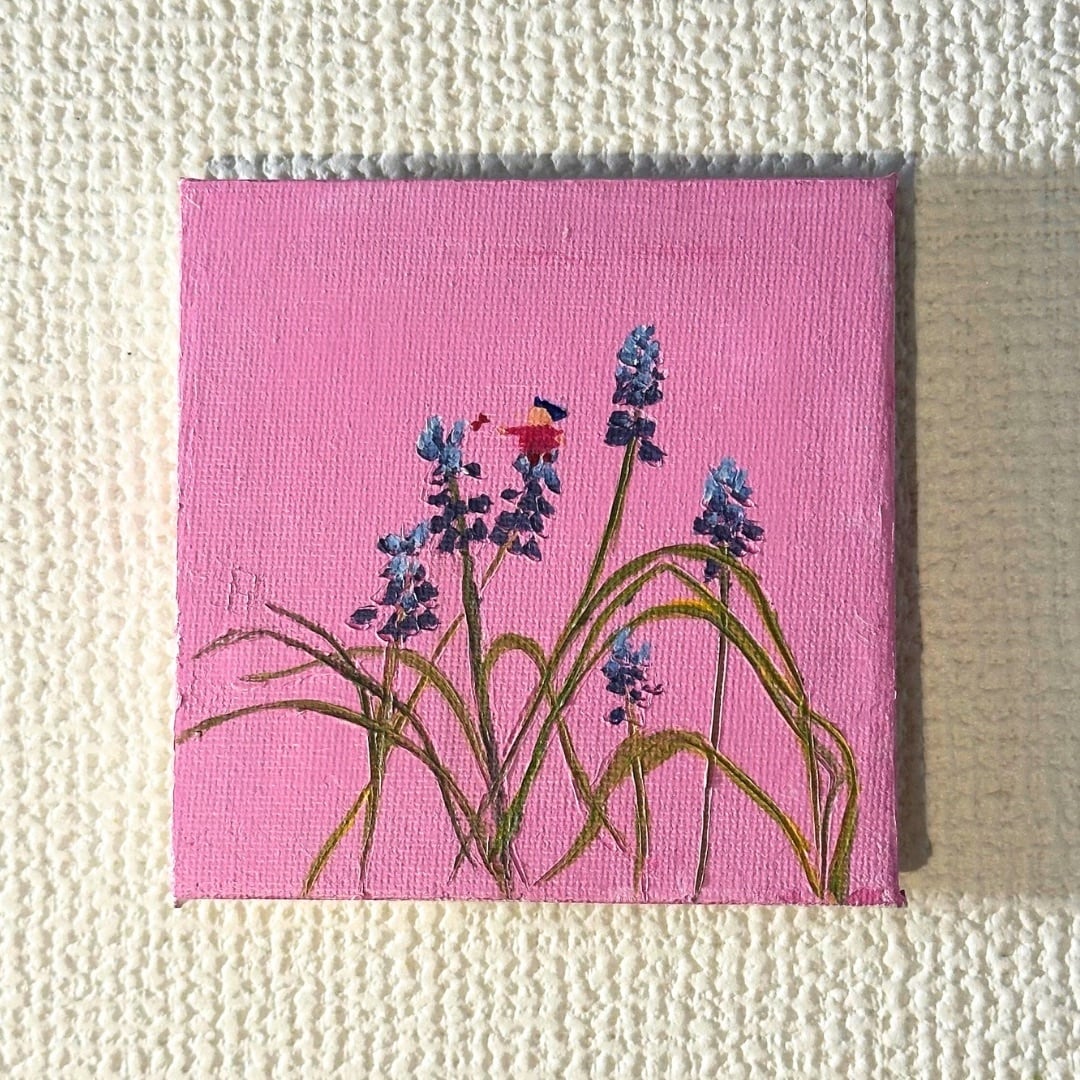 可愛らしいムスカリの花が咲き誇る春の情景。チビころちゃんのおかげで、周りには蝶々も寄り添い、楽しい井戸端会議が繰り広げられています。このアート作品は、見る人に寛大な愛を感じさせ、春の幸福感を引き出してくれる一枚です。