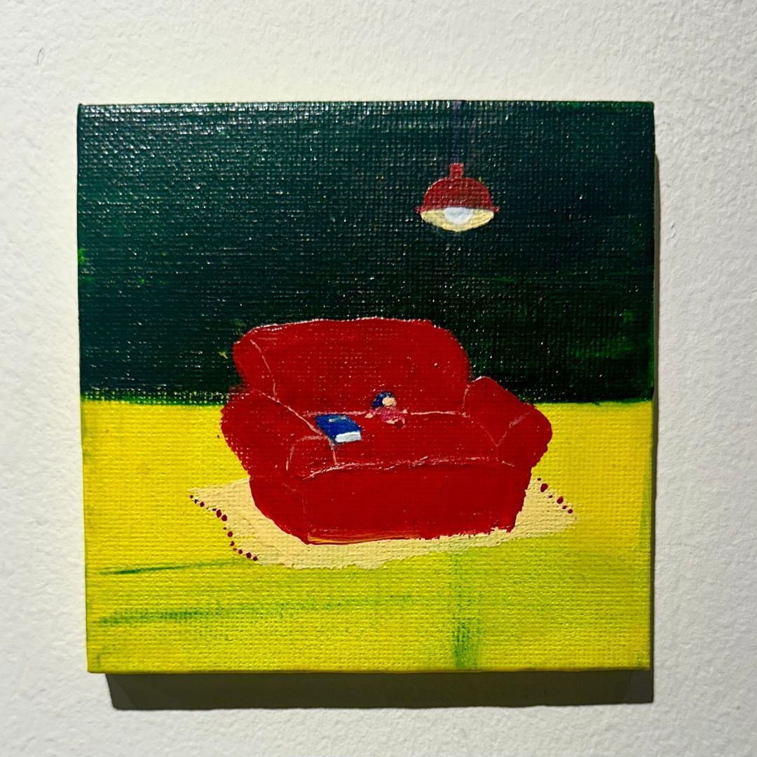 赤いお気に入りのソファーに、チビころちゃんが座って一休みしている様子が描かれています。このソファは、まるで安心を呼び込む場所のよう。疲れた心を癒すために、ただ座ることがこんなにも特別な時間になることを教えてくれます。